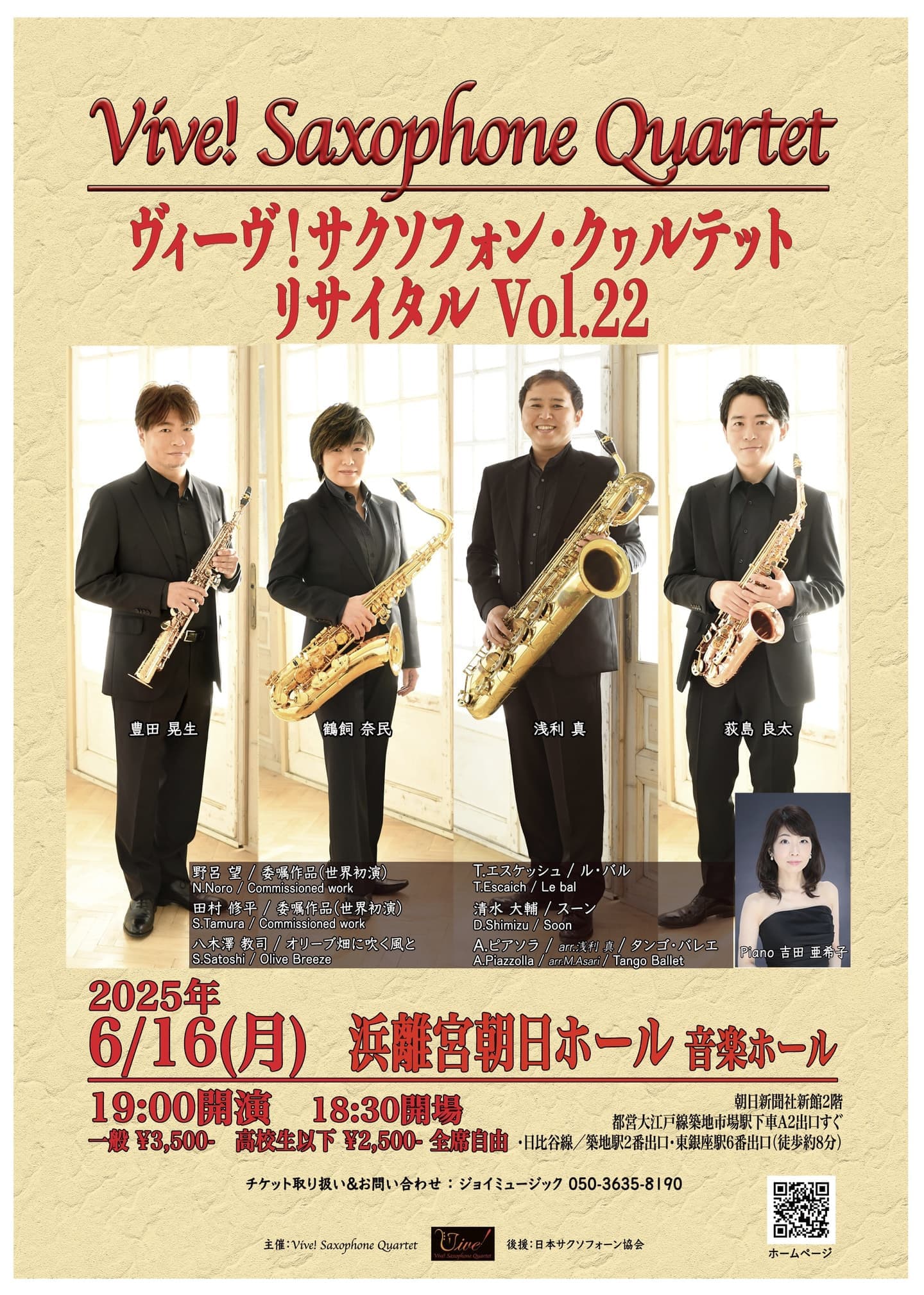 ヴィーヴ!の特色でもある委嘱作品は今回は野呂望氏と田村修平氏のお二人にお願いしております。また2つの作品をサクソフォンアンサンブルのレパートリーとして迎えられる事に喜びを感じています。
