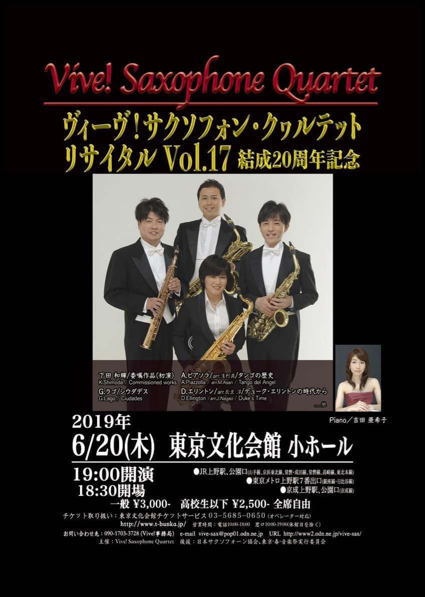 第17回 2019年6月20日 東京都台東区 東京文化会館小ホール(結成20周年記念公演) | I.アルベニス / セビリア 下田和輝 / リリカル・ゴールド〜サクソフォーン四重奏のために〜 (委嘱作品世界初演) G.ラゴ / シウダデス A.ピアソラ(浅利真編曲)/ タンゴの歴史(四重奏+ピアノ) D.エリントン(長生淳編曲) / デューク・エリントンの時代から (四重奏+ピアノ) D.フォスター / ザ・プレイヤー 村松崇継(浅利真編曲)/ 彼方の光 |