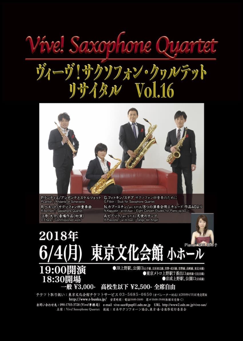 第16回 2018年6月 4日 東京都台東区 東京文化会館小ホール | P.ランティエ / アンダンテとスケルツェット R.ベネット / サクソフォン四重奏曲 江原大介 / パッシオーネ(委嘱作品世界初演) G.フィトキン / スタブ N.カプースチン(浅利真編曲)/ 8つの演奏会用エチュードより 4,8 A.ピアソラ(浅利真編曲) / 天使のタンゴ(四重奏+ピアノ) 中村由利子 / 青春のロンド |