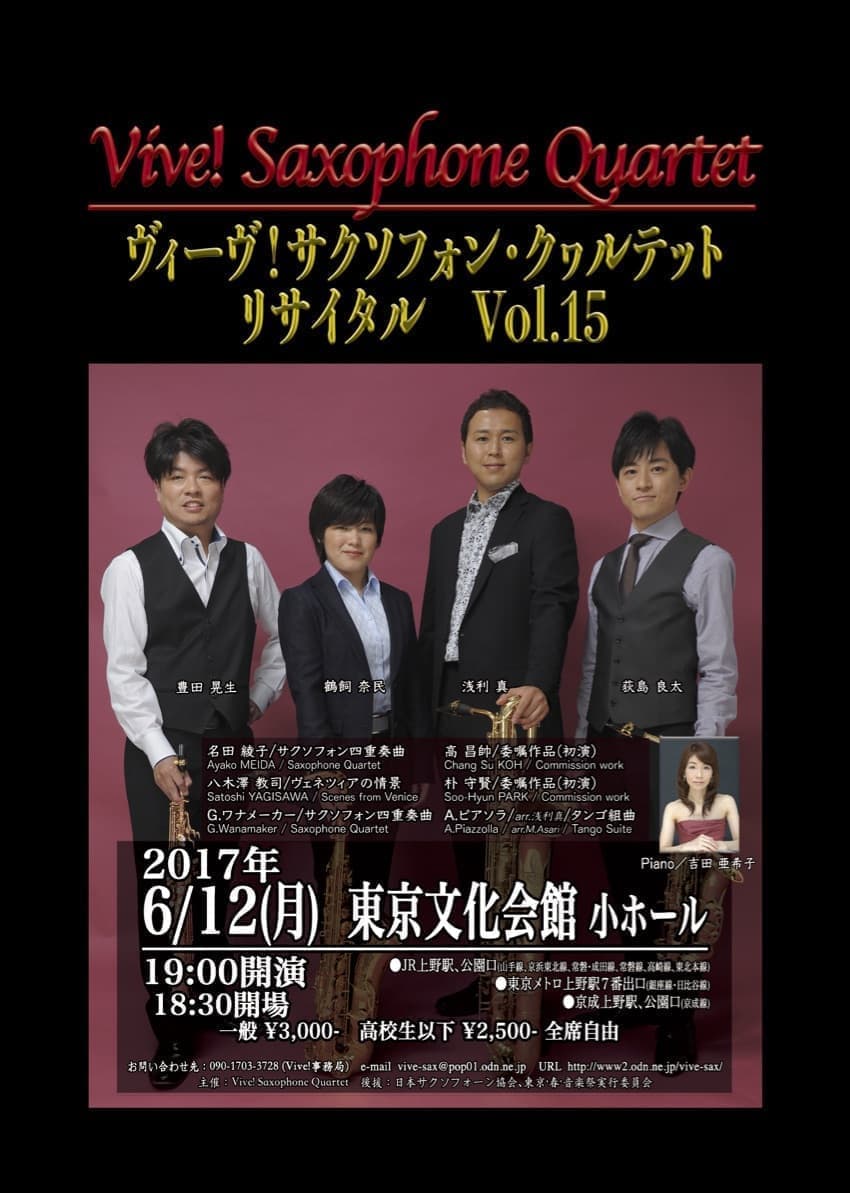 第15回 2017年6月12日 東京都台東区 東京文化会館小ホール | 名田綾子 / サクソフォーン四重奏曲 八木澤教司 / ヴェネツィアの情景(四重奏版初演) G.ワナメーカー / サクソフォーン四重奏曲 高昌帥 / ファンタジア(委嘱作品世界初演) 朴守賢 / 悠遠の雪(委嘱作品世界初演) A.ピアソラ(浅利真編曲) / タンゴ組曲(四重奏+ピアノ) 千住明 / エターナルライト |