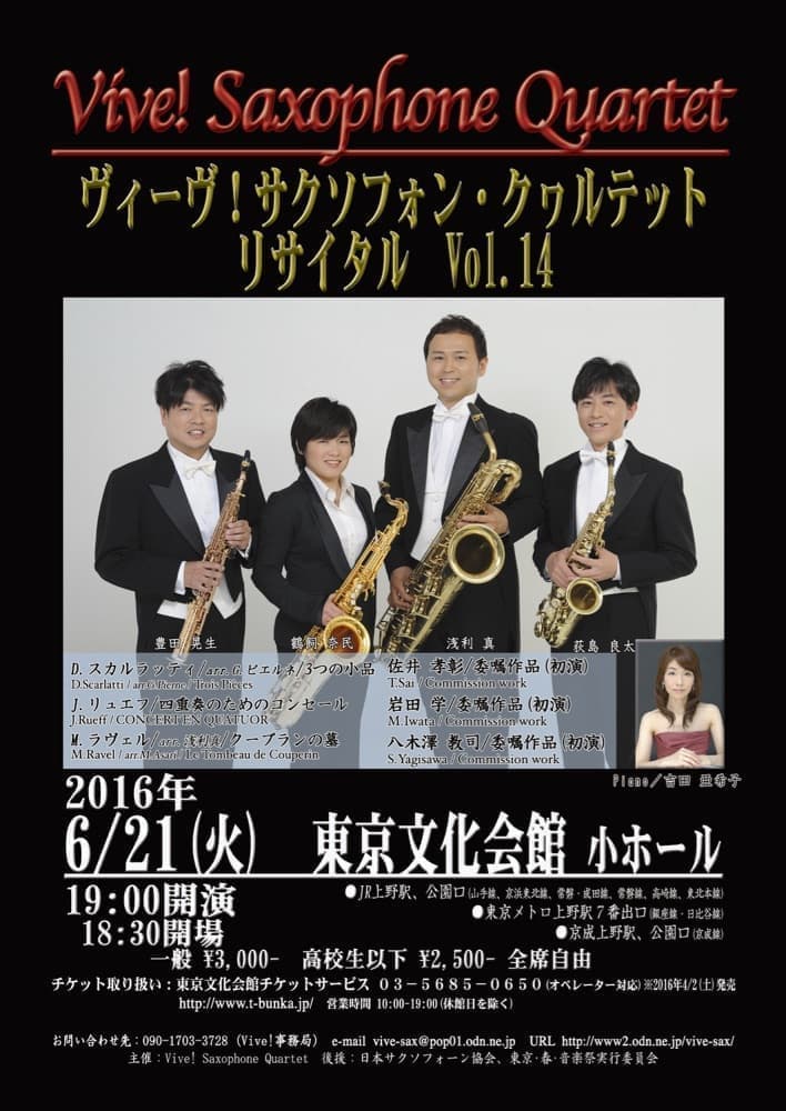 第14回 2016年6月21日 東京都台東区 東京文化会館小ホール | D.スカルラッティ / 3つの小品 岩田学 / プラネット・ナイン(委嘱作品世界初演) J.リュエフ / 四重奏の為のコンセール 佐井孝彰 / カプリッチョ2(委嘱作品世界初演) 八木澤教司 / 愛のソナチネ(委嘱作品世界初演) M.ラヴェル (浅利真編曲)/ クープランの墓(四重奏+ピアノ) A.ピアソラ(浅利真編曲)/ アヴェ・マリア(四重奏+ピアノ) |