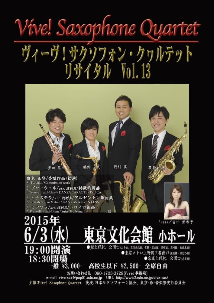 第13回 2015年6月3日 東京都台東区 東京文化会館小ホール | A.トロイロ / 嘘つき女 A.ピアソラ / デカリシモ L.ブローウェル / 特徴的舞曲 L.ブローウェル / 11月のある日 A.ヒナステラ / アルゼンチン舞曲集 露木正登 / トリプティーク(委嘱作品世界初演) A.ピアソラ(浅利真編曲) / メディタンゴ(四重奏+ピアノ) A.ピアソラ(浅利真編曲) / トリスタンゴ(四重奏+ピアノ) A.ピアソラ(浅利真編曲) / リベルタンゴ(四重奏+ピアノ) A.ピアソラ(浅利真編曲) / トロイロ組曲(四重奏+ピアノ) 八木澤教司 / 愁陽の路 C.ガルデル / 想いの届く日 |