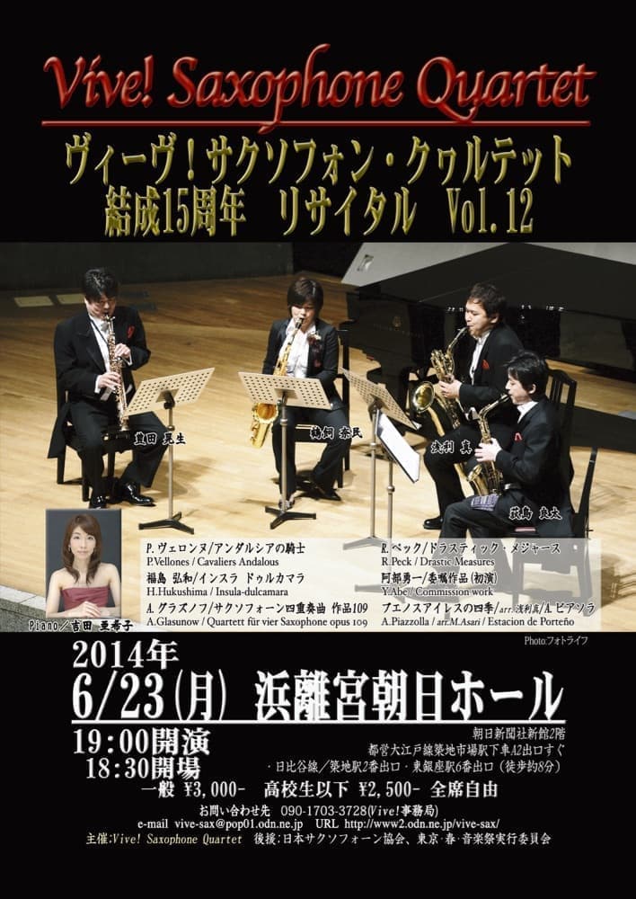 第12回 2014年6月23日 東京都中央区 浜離宮朝日ホール(結成15周年記念公演) | P.ヴェロンヌ / アンダルシアの騎士 福島弘和 / インスラドゥルカマラ(2006年委嘱作品) A.グラズノフ / サクソフォン四重奏曲 作品109 R.ペック / ドラスティックメジャース 阿部勇一 / ローカス(委嘱作品世界初演) A.ピアソラ(浅利真編曲) / ブエノスアイレスの四季全曲(四重奏+ピアノ) 原信夫(浅利真編曲)/ 真っ赤な太陽 C-M.シェーンベルグ / ブリング・ヒム・ホーム |