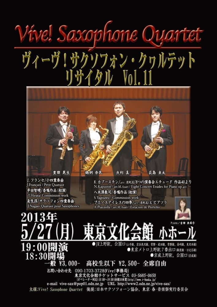 第11回 2013年5月27日 東京都台東区 東京文化会館小ホール | J.フランセ / 小四重奏曲 八木澤教司 / ボッカ・デラ・ヴェリタ(委嘱作品世界初演) 長生淳 / 四重奏曲 N.カプースチン(浅利真編曲)/ 8つの演奏会用エチュードより 2,5,6 平田智暁 / サクソフォーンのための小奏鳴曲(ソナティーヌ)(委嘱作品世界初演) A.ピアソラ(浅利真編曲)/ ブエノスアイレスの秋,冬(四重奏+ピアノ) P.I.チャイコフスキー (浅利真編曲)/ くるみ割り人形メドレー C-M.シェーンベルグ / オン・マイ・オウン |
