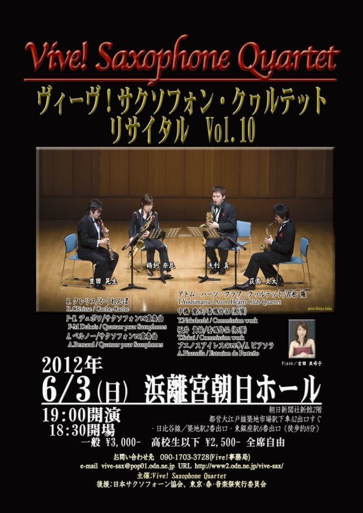 第10回 2012年6月3日 東京都中央区 浜離宮朝日ホール | R.クレリス / かくれんぼ P.M.デュボワ / サクソフォン四重奏曲 A.ベルノー / サクソフォン四重奏曲 吉松隆 / アトム・ハーツ・クラブ・クヮルテット 中橋愛生 / コンヴェクション(委嘱作品世界初演) 坂井貴祐 / アリオーソとトッカータ(委嘱作品世界初演) A.ピアソラ(浅利真編曲) / ブエノスアイレスの春,夏(四重奏+ピアノ) A.L.ウェバー / All I Ask of You |