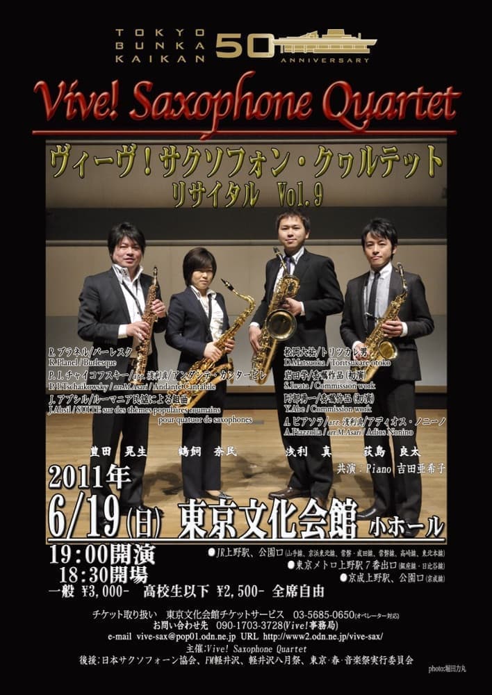 第9回 2011年6月19日 東京都台東区 東京文化会館小ホール | R.プラネル / バーレスク P.I.チャイコフスキー / アンダンテ・カンタービレ J.アプシル / ルーマニア民謡による組曲 松岡大祐 / トリツカレ男 岩田学 / ヒア(委嘱作品世界初演) 阿部勇一 / ライフ・インデックス(委嘱作品世界初演) A.ピアソラ(浅利真編曲) / アディオス・ノニーノ(四重奏+ピアノ) P.M.デュボワ / 性格的小品集より「パリジェンヌ風に」 清水大輔 / スーン 2楽章 |