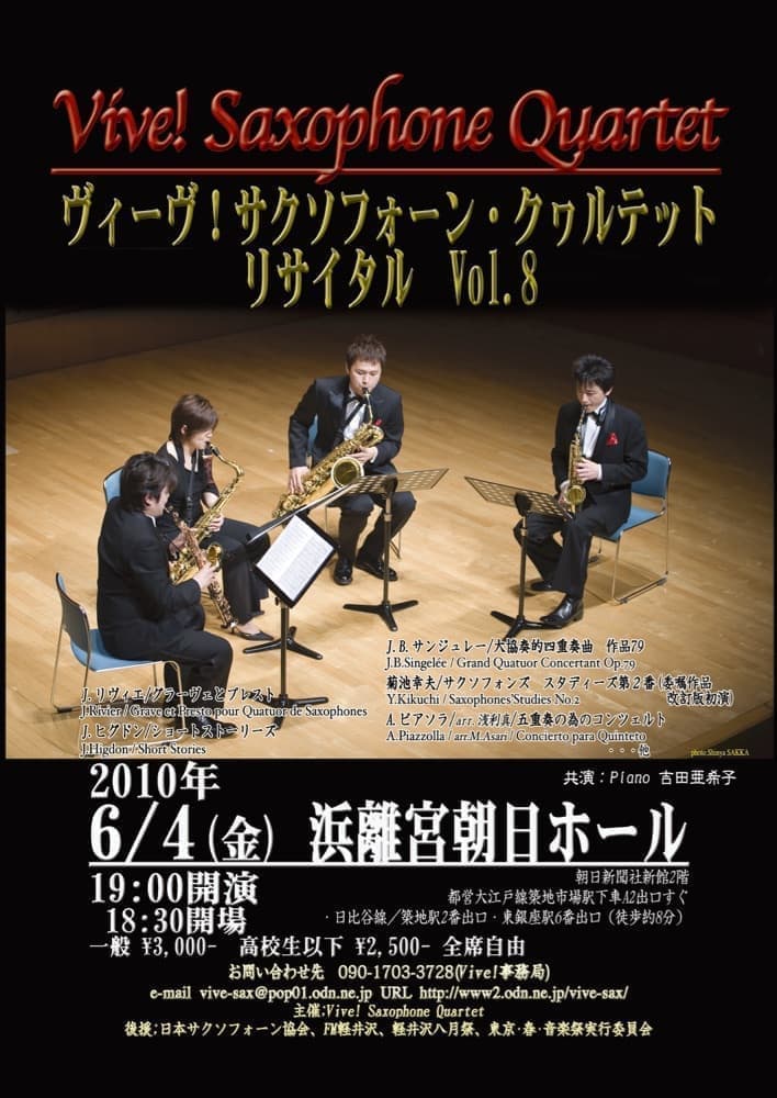 第8回 2010年6月 東京都中央区 浜離宮朝日ホール | J.リヴィエ / グラーヴェとプレスト J.ヒグドン / ショートストーリーズ J.P.サンジュレー / 大四重奏曲 菊地幸夫 / サクソフォンズ・スタディーズ2(2009年委嘱作品改訂版初演) L.ブローウェル(荻島良太編曲) / 11月のある日 A.ピアソラ(浅利真編曲)/ 五重奏の為のコンチェルト(四重奏+ピアノ) L.ブローウェル(浅利真編曲)/ 特徴的な舞曲 E.モリコーネ(浅利真編曲)/ 愛を奏でて |