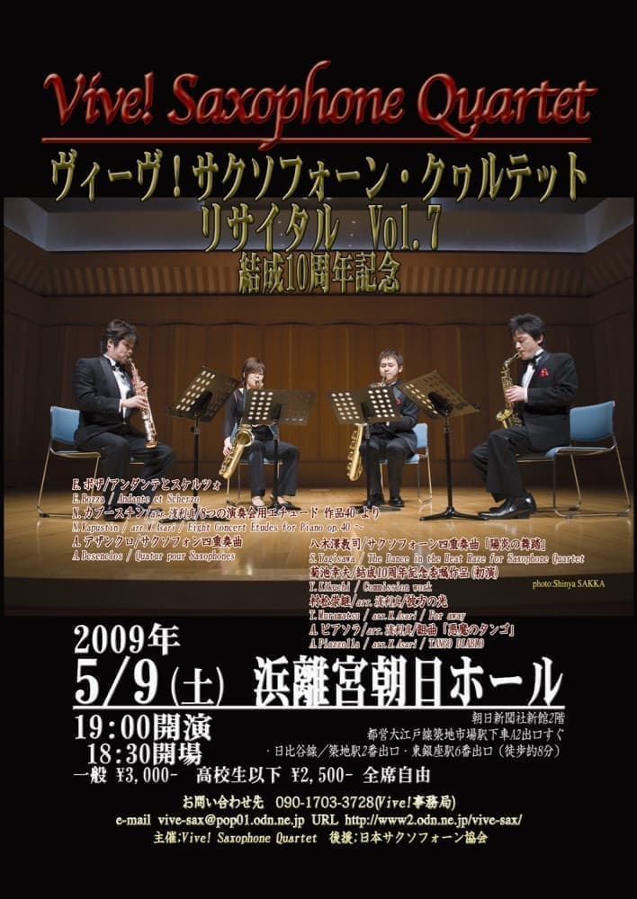 第7回 2009年5月 東京都中央区 浜離宮朝日ホール(結成10周年記念公演) | E.ボザ / アンダンテとスケルツォ N.カプースチン(浅利真編曲)/ 8つの演奏会用エチュードより 1,3,7 A.デザンクロ / 四重奏曲 八木澤教司 / 陽炎の舞踏(2006年委嘱作品) 菊地幸夫 / サクソフォンズ・スタディーズ2(委嘱作品世界初演) 村松崇継(浅利真編曲)/ 彼方の光 A.ピアソラ(浅利真編曲) / 悪魔のタンゴ(四重奏+ピアノ) A.ピアソラ(浅利真編曲)/ デカリシモ(四重奏+ピアノ) 広瀬勇人 / 春の小径 |