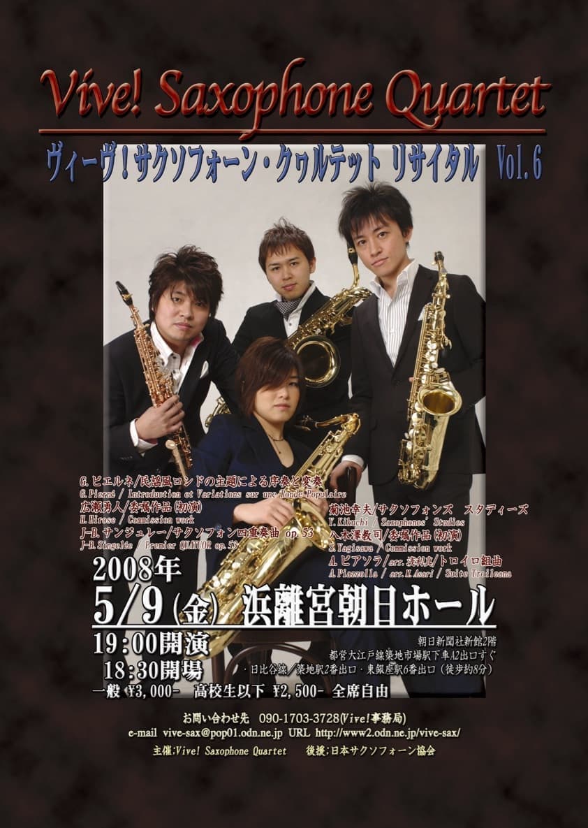 第6回 2008年5月9日 東京都中央区 浜離宮朝日ホール | G.ピエルネ / 民謡風ロンドの主題による序奏と変奏 八木澤教司 / 3つのバガテル(委嘱作品世界初演) J-P.サンジュレー / サクソフォン四重奏曲 op.53 菊地幸夫 / サクソフォンズ スタディーズ 広瀬勇人 / 春の小径(委嘱作品世界初演) A.ピアソラ(浅利真編曲)/ トロイロ組曲(四重奏+ピアノ) P.モーリス / プロヴァンスの風景 2,3 J.ブラームス / 作品118-2 |