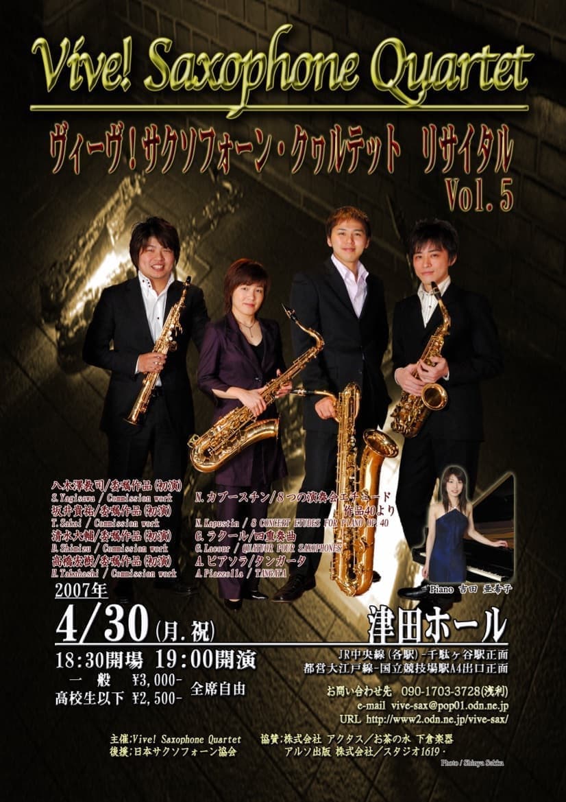 第5回 2007年4月 東京都渋谷区 津田ホール | N.カプースチン(浅利真編曲)/ 8つの演奏会用エチュードより 1,3,7 高橋宏樹 / グリムの古城(委嘱作品世界初演) 坂井貴祐 / ペンタグラム(委嘱作品世界初演) G.ラクール / サクソフォン四重奏曲 清水大輔 / アイヴズ・マインド2(委嘱作品世界初演)(四重奏+ピアノ) 八木澤教司 / アスキ・カタスキ・ハイクス・テトラクス・ダムナメネウス・アイシオン(委嘱作品世界初演) A.ピアソラ(浅利真編曲)/ タンガータ(四重奏+ピアノ) 村松隆継(浅利真編曲)/ 彼方の光 |