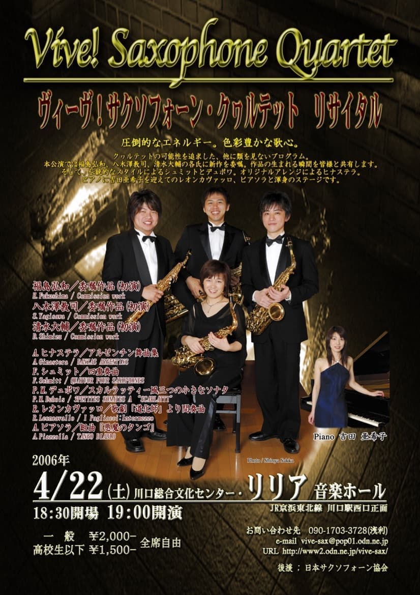 第4回 2006年4月22日 埼玉県川口市 川口総合文化センター「リリア」 音楽ホール | A.ヒナステラ / アルゼンチン舞曲集 福島弘和 / インスラドゥルカマラ(委嘱作品世界初演) 清水大輔 / レダ・アトミカ(委嘱作品世界初演) F.シュミット / 四重奏曲 P.M.デュボワ / スカルラッティ風3つの小さなソナタ 八木澤教司 / 陽炎の舞踏(委嘱作品世界初演) R.レオンカヴァッロ / 道化師より間奏曲(四重奏+ピアノ) A.ピアソラ (浅利真編曲)/ 悪魔のタンゴ(四重奏+ピアノ) A.ピアソラ / デカリシモ(四重奏+ピアノ) |