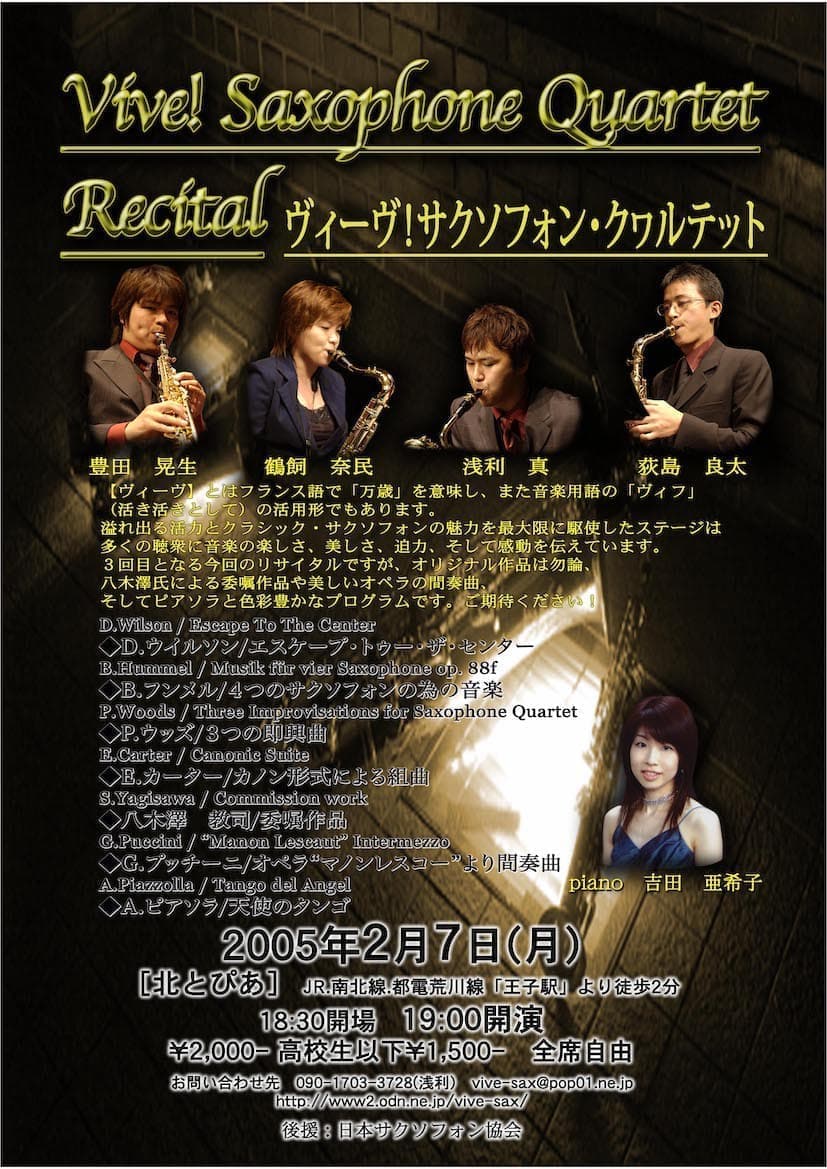 第3回 2005年2月7日 東京都北区 北とぴあ つつじホール | D.ウィルソン / エスケープ・トゥ・ザ・センター B.フンメル / 4つのサクソフォンのための音楽 P.ウッズ / 3つの即興曲 E.カーター / カノン形式による組曲 八木澤教司 / ノヴェレッテ(委嘱作品世界初演) G.プッチーニ / マノンレスコーより間奏曲(四重奏+ピアノ) A.ピアソラ(浅利真編曲)/ 天使のタンゴ(四重奏+ピアノ) E.モリコーネ / 愛を奏でて |