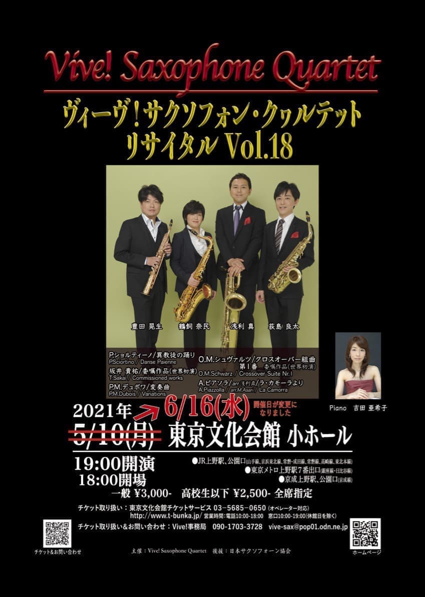 第18回 2021年6月16日 東京都台東区 東京文化会館小ホール | P.ショルティーノ / 異教徒の躍り 坂井貴祐 / プラザ・デ・エスパーニャ (委嘱作品世界初演) P.M.デュボワ / 変奏曲 O.M.シュヴァルツ / クロスオーバー組曲第1番 (委嘱作品世界初演) A.ピアソラ(浅利真編曲) / 「ラ・カモーラ」より2,3 (四重奏+ピアノ) A.ピアソラ(浅利真編曲) / アヴェ・マリア(四重奏+ピアノ) |