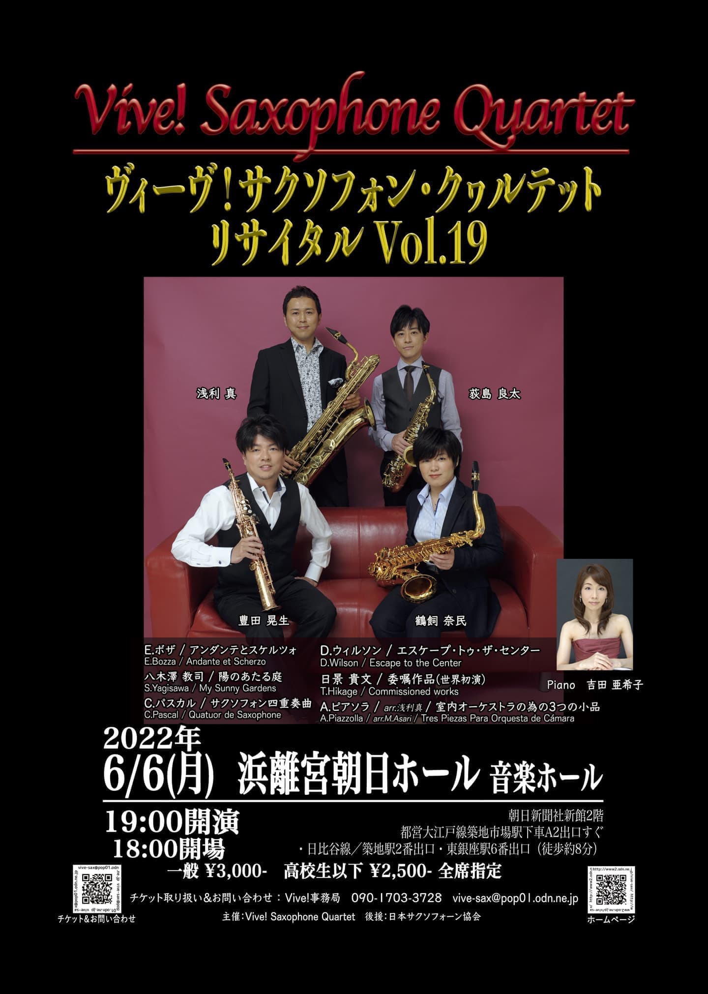 第19回 2022年6月6日 東京都中央区 浜離宮朝日ホール | E.ボザ / アンダンテとスケルツォ 八木澤教司 / 陽のあたる庭 (四重奏版初演) C.パスカル / サクソフォン四重奏曲 D.ウィルソン / エスケープ・トゥ・ザ・センター 日景貴文 / アウト・ザ・ムード(委嘱作品世界初演) A.ピアソラ(浅利真編曲) / タンガータ (四重奏+ピアノ) 村松崇継(浅利真編曲) / あなたがいるから(四重奏+ピアノ) |