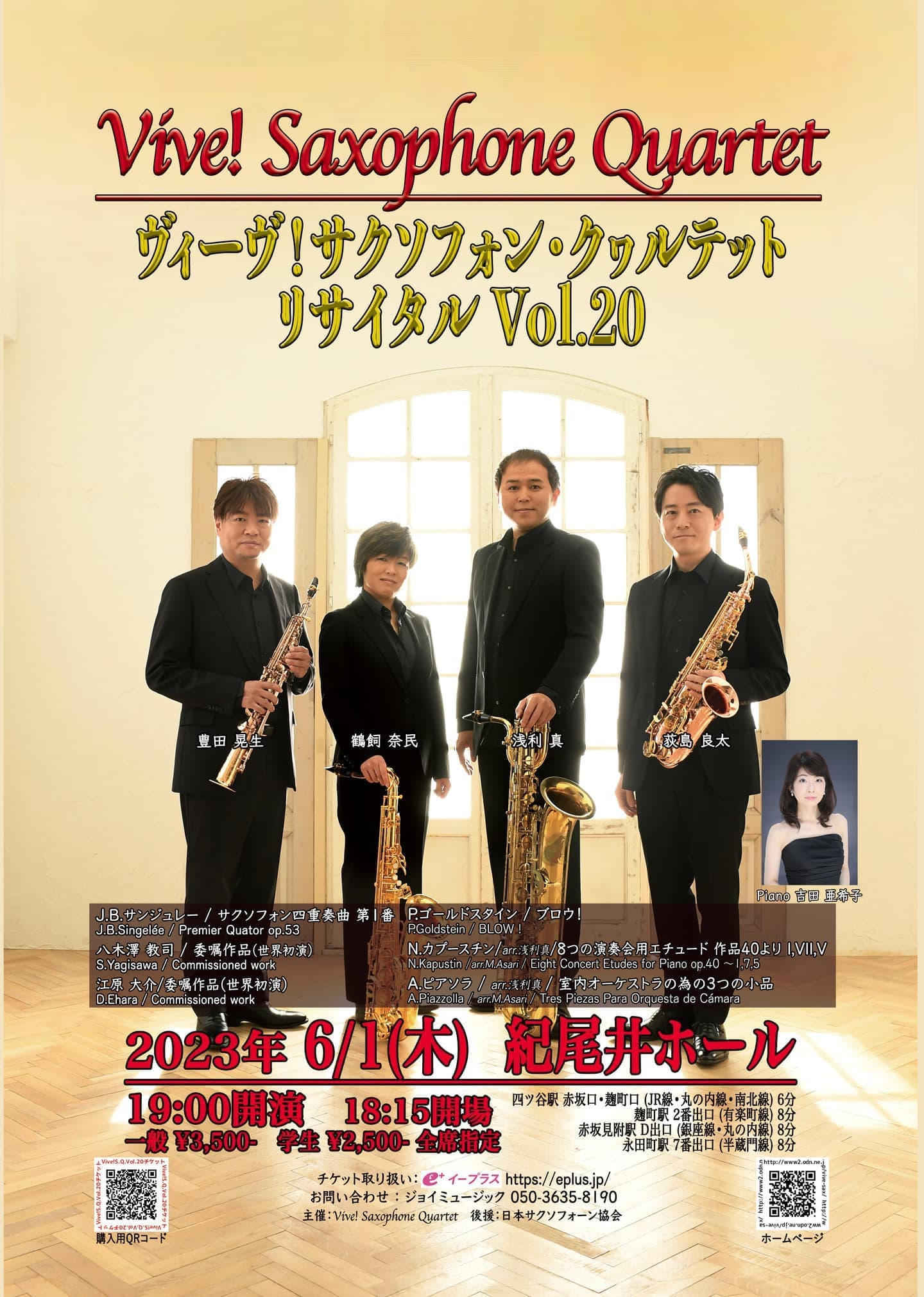 第20回 2023年6月1日 東京都千代田区 紀尾井ホール | J.B.サンジュレー / サクソフォン四重奏曲第1番 八木澤教司 / サントリーニで休日を (委嘱作品世界初演) P.ゴールドスタイン / ブロウ! N.カプースチン(浅利真編曲) / 8つの演奏会用エチュード作品より 1,7,5 江原大介 / 仮想の月(委嘱作品世界初演) A.ピアソラ(浅利真編曲) / 室内オーケストラの為の3つの小品 (四重奏+ピアノ) A.ピアソラ (浅利真編曲) / 悪魔をやっつけろ(四重奏+ピアノ) |